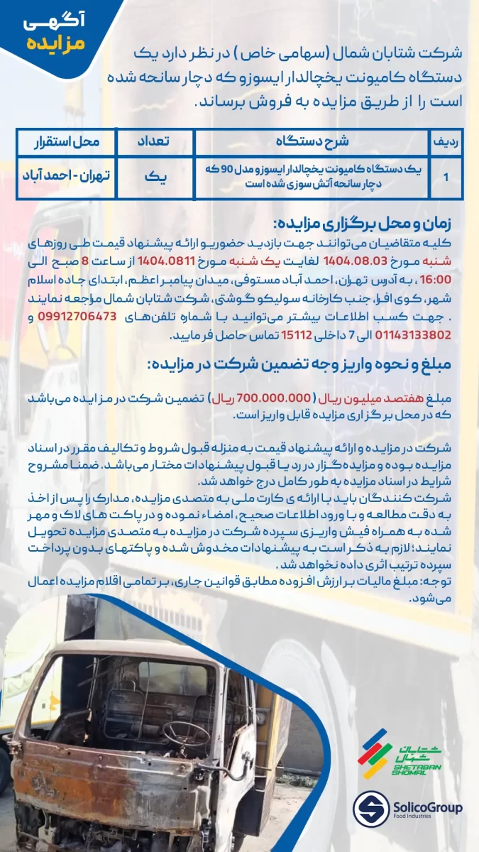 شرکت شتابان شمال (سهامی خاص) در ادامه برنامه نوسازی و ساماندهی داراییهای ناوگان خود، قصد دارد یک دستگاه کامیونت یخچالدار ایسوزو مدل ۹۰ را که بر اثر سانحه آتشسوزی دچار خسارت شده است، از طریق مزایده عمومی به فروش برساند. […]