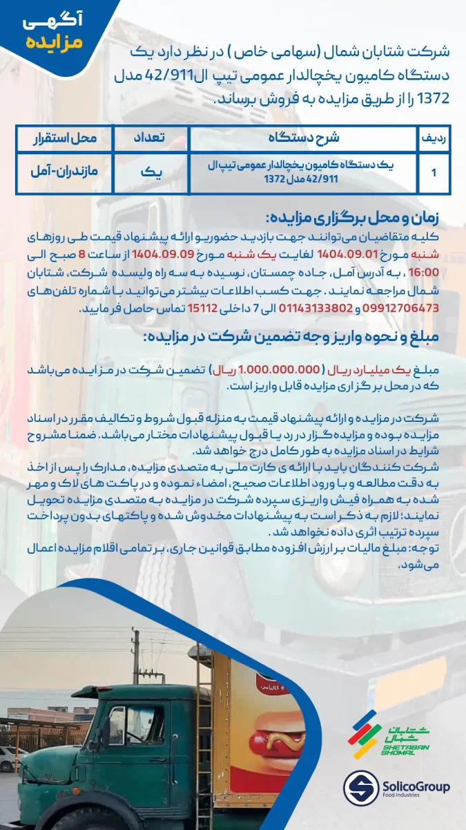 🟩 معرفی مزایده شرکت شتابان شمال (سهامی خاص) در نظر دارد یک دستگاه کامیون یخچالدار عمومی تیپ ال 42/911 مدل ۱۳۷۲ را از طریق مزایده عمومی به فروش برساند. این مزایده فرصت مناسبی برای فعالان حملونقل سردخانهای و خریداران خودروهای […]