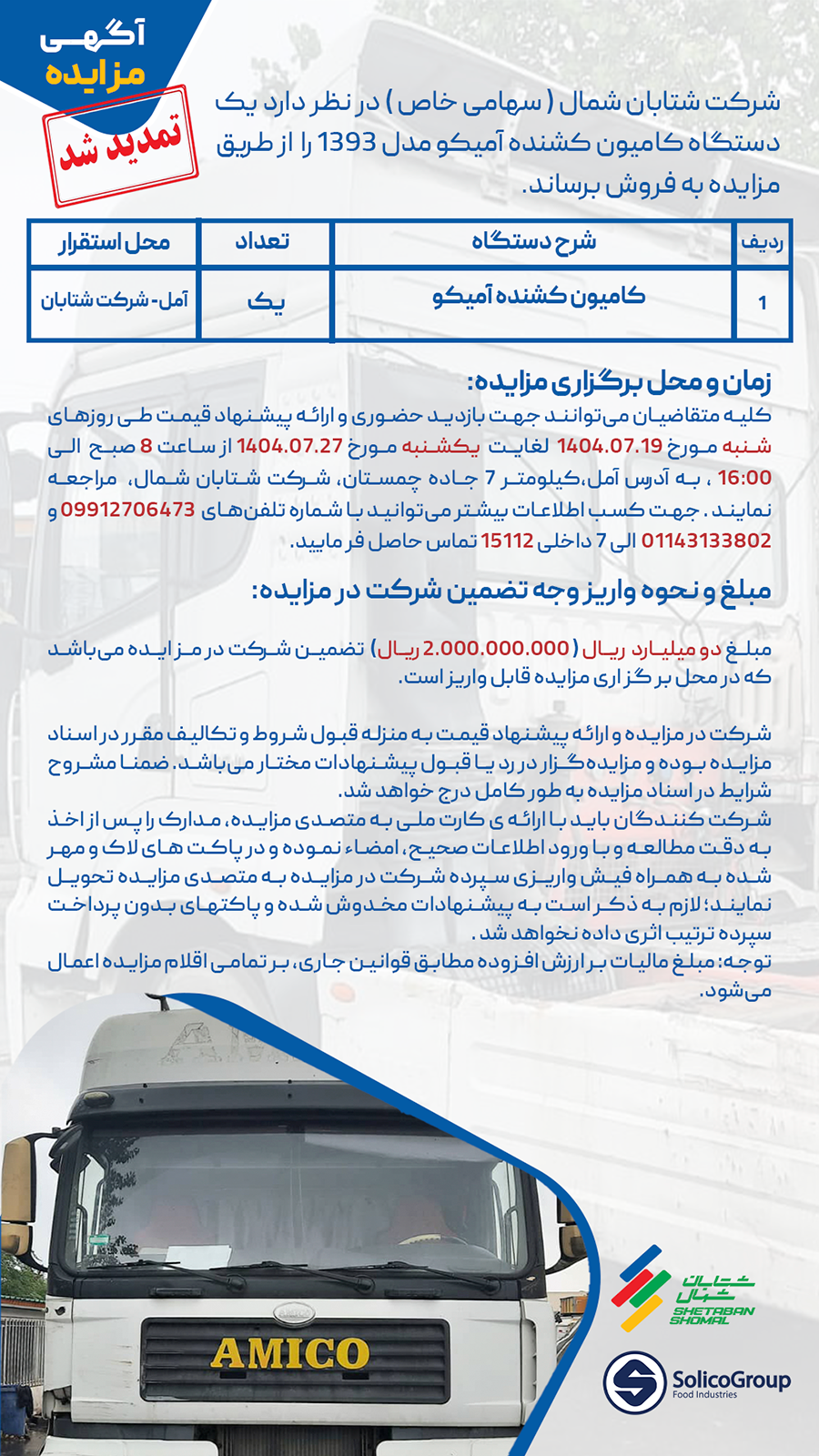 شرکت شتابان شمال (سهامی خاص) در راستای نوسازی ناوگان حملونقل خود، قصد دارد یک دستگاه کامیون کشنده آمیکو مدل ۱۳۹۳ را از طریق مزایده عمومی به فروش برساند.