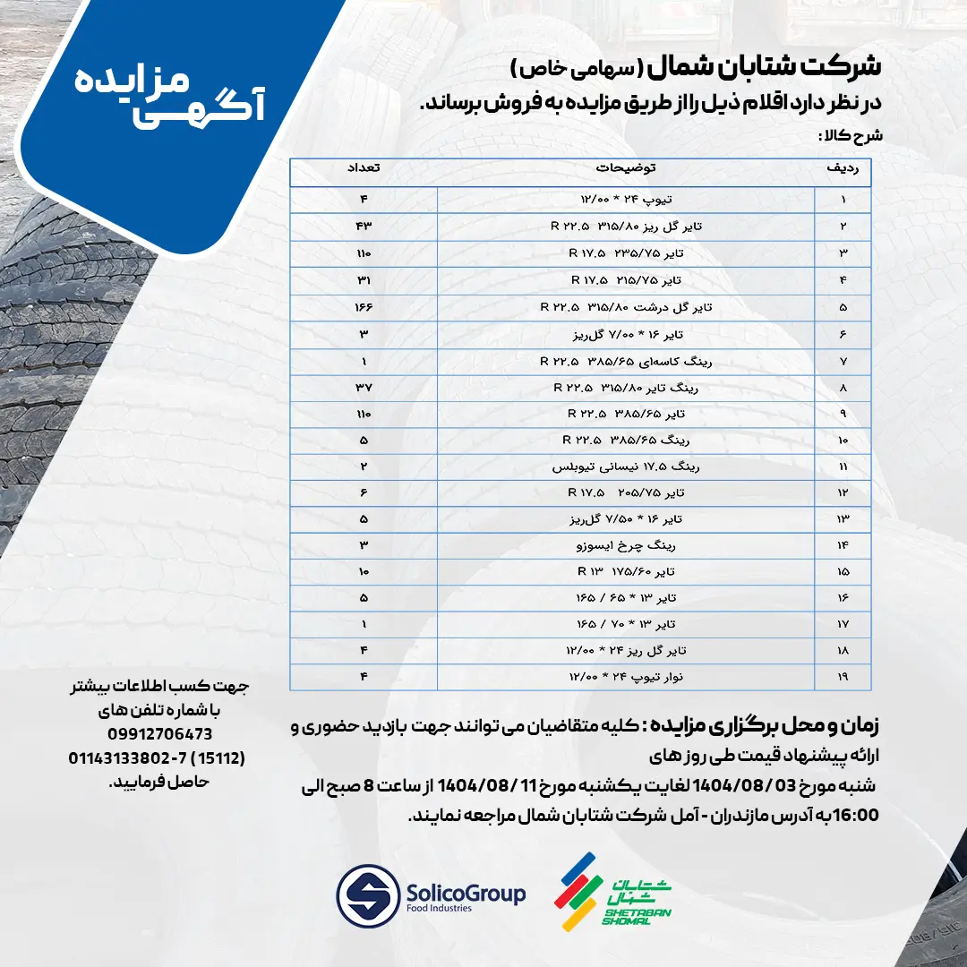 شرکت شتابان شمال (سهامی خاص) در راستای مدیریت بهینه ناوگان حملونقل و تجهیزات پشتیبانی، اقدام به برگزاری مزایده عمومی فروش انواع لاستیک و رینگ خودروهای سنگین و نیمهسنگین مینماید.