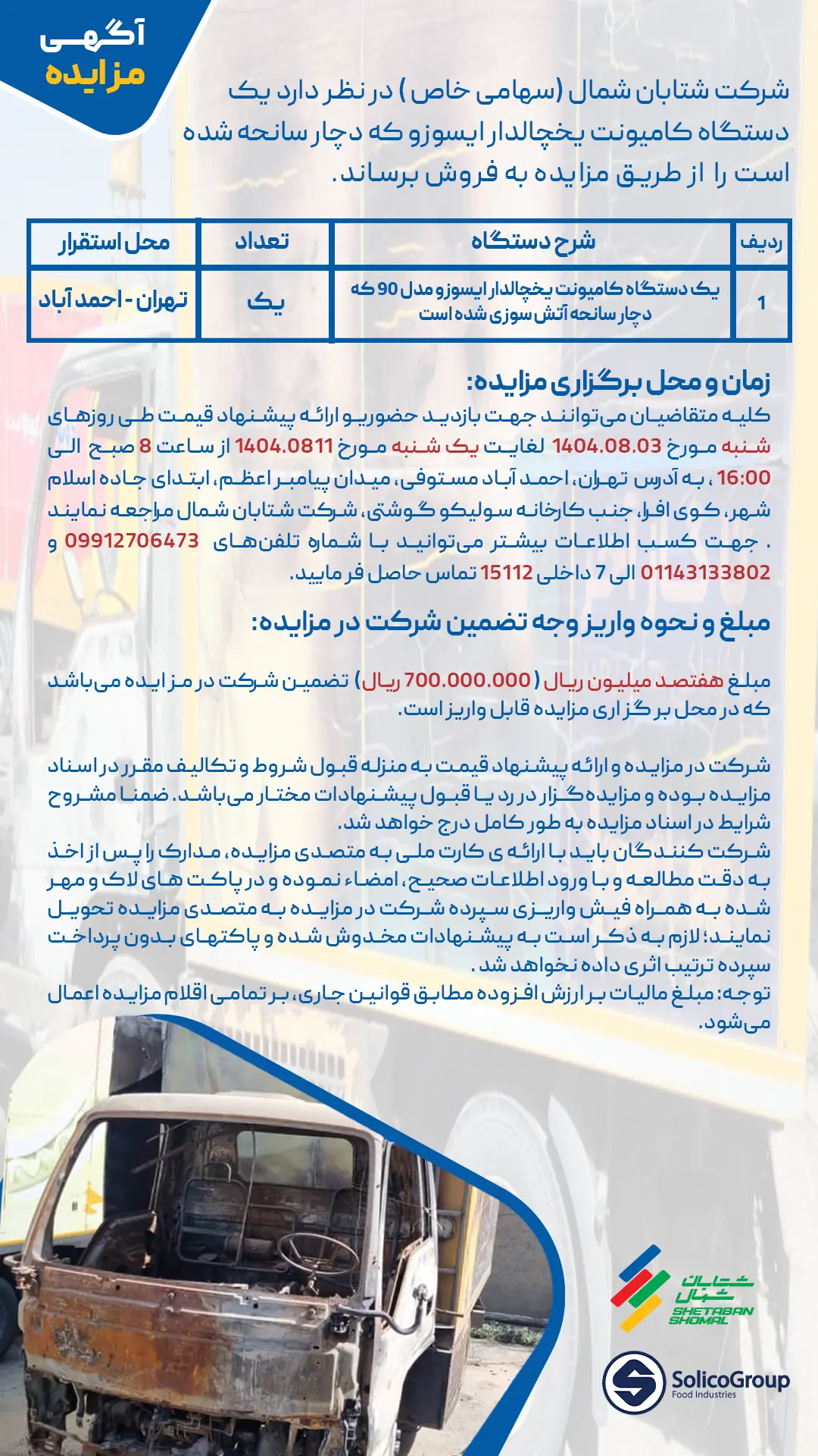 شرکت شتابان شمال (سهامی خاص) در ادامه برنامه نوسازی و ساماندهی داراییهای ناوگان خود، قصد دارد یک دستگاه کامیونت یخچالدار ایسوزو مدل ۹۰ را که بر اثر سانحه آتشسوزی دچار خسارت شده است، از طریق مزایده عمومی به فروش برساند.